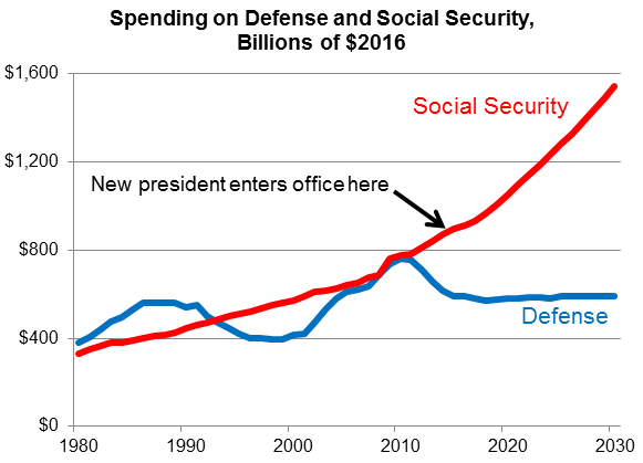 When the next president enters office in 2017, he will start planning his 2018 budget. In that year, Social Security will become the first trillion-dollar program, and it will be gobbling up an additional $60 billion or so every single year.