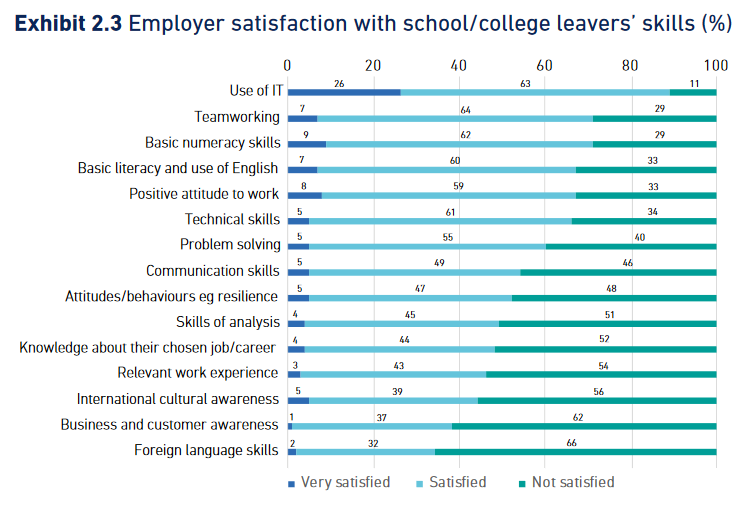 But if a recent report out of the U.K. is any indication, a college degree does not necessarily a good employee make. As the chart below shows, many employers are increasingly dissatisfied with new employee attitudes toward work, problem-solving and communication skills, and the ability to relate well to customers.