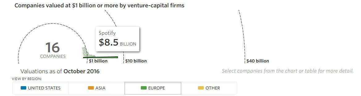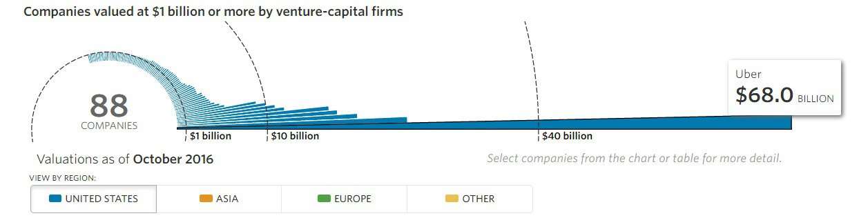 And if you want to know what the phrase “positive externalities” means in this case, take a look at these two charts from the Wall Street Journal looking at venture-backed private companies valued at $1 billion or more in Europe and America.