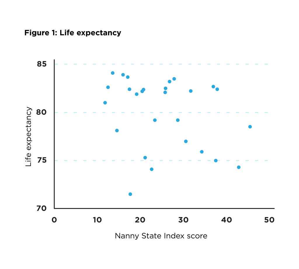 There is little evidence that countries with more paternalistic policies enjoy greater health or longevity. As Figure 1 shows, there is no correlation between Nanny State Index scores and life expectancy.