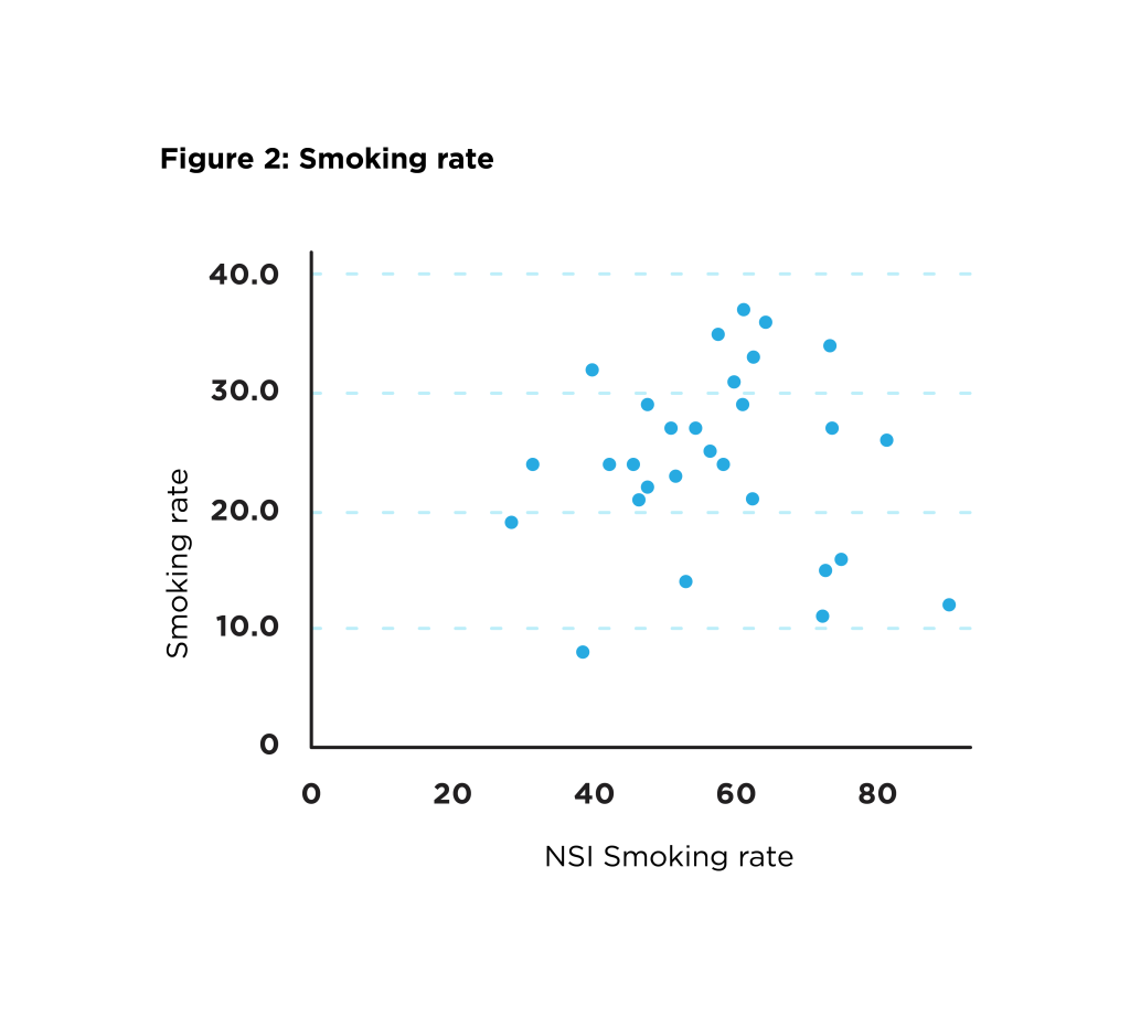 There is no correlation between tobacco control scores and lower smoking rates (Figure 2).