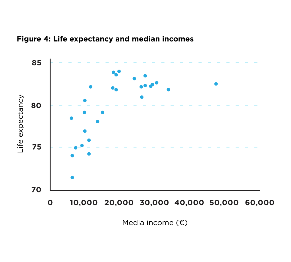 Figure 4 shows the relationship between life expectancy and economic prosperity as measured by median incomes. This data suggests that pursuing economic growth would bring much greater benefits to public health than paternalistic and coercive efforts to control personal behavior with bans and taxes.