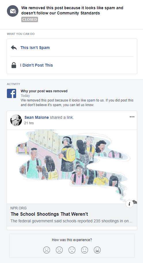 My colleague shared NPR’s article with a few thousand Facebook friends and followers on Tuesday. It was flagged as spam and removed.