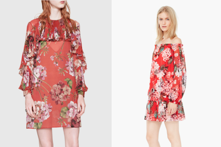 The dress on the left is made by Gucci, and the one on the right is made by the fast fashion company Mango. Can you tell the difference?