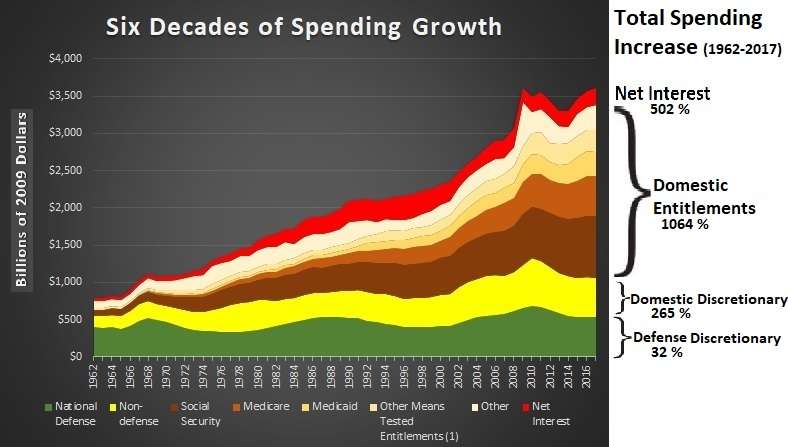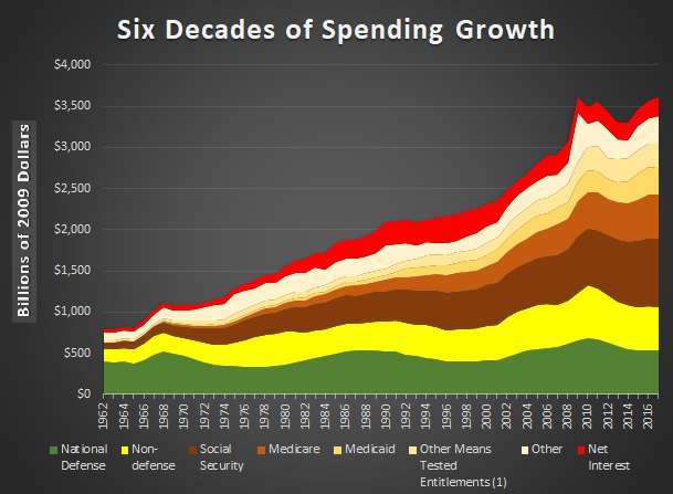 Our first chart (based on Table 8.2 from the Office of Management and Budget’s Historical Tables) shows what has happened to major spending categories from 1962 to 2017. And all the data is in inflation-adjusted dollars (2009 benchmark) to accurately gauge how and why the burden of federal spending has grown.