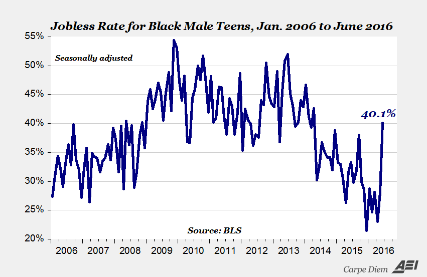 Perhaps one of the more interesting data points from last week’s Employment Report is displayed in the graph above, which shows that the jobless rate for black male teens (aged 16-19 years) increased to 40.1% in June from 28.1% in May. Except for a slightly higher increase of 12.2 percentage points during the aftermath of the Great Recession, the 12 percentage point increase in June was the highest monthly increase in history going back to 1972 when the BLS starting keeping records for this series. One possible explanation for this spike would be the “midyear burst of minimum-wage increases on July 1” outlined in a recent WSJ article: