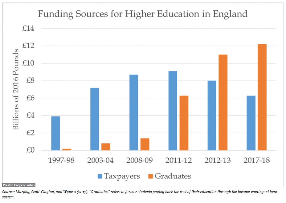 Sensing a problem, the English college system changed course and began slowly requiring students to pay for more of the costs, most notably through loans which they would pay back once they began their careers. Preston Cooper summarizes the results in a column for Forbes: