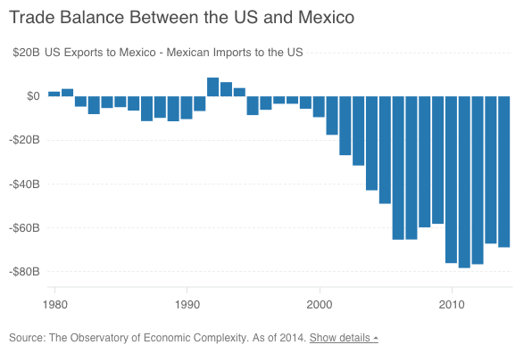 Meanwhile, NAFTA, which comes from a previous generation of trade deals, has some of these problems (there are certain labor and environmental standards in the agreement) but not to the extent that it harmonizes regulation. Instead, what may have happened over the years is that companies might have been forced out of the U.S. to Mexico by America’s hyper-regulation (the chart below, from a CNBC story, shows how the balance of trade with Mexico gets much worse after 2003, a time when there appears to have been a steep change in the cost of regulation in the U.S. – see Table 2 in Ten Thousand Commandments).