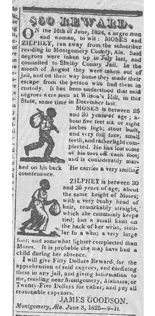 Consider the journey of fugitives Moses and Zilphey, who were probably a married couple and were sought by James Goodson of Montgomery, Alabama, in June 1825. In the advertisement he placed in the paper offering US$50 for their capture, Goodson explained that Moses and Zilphey had first fled from him a year earlier and had made it more than 75 miles north before they were caught and put in the Shelby County jail. Goodson had sent someone to take them into custody and return them, only to have the couple escape from that person.