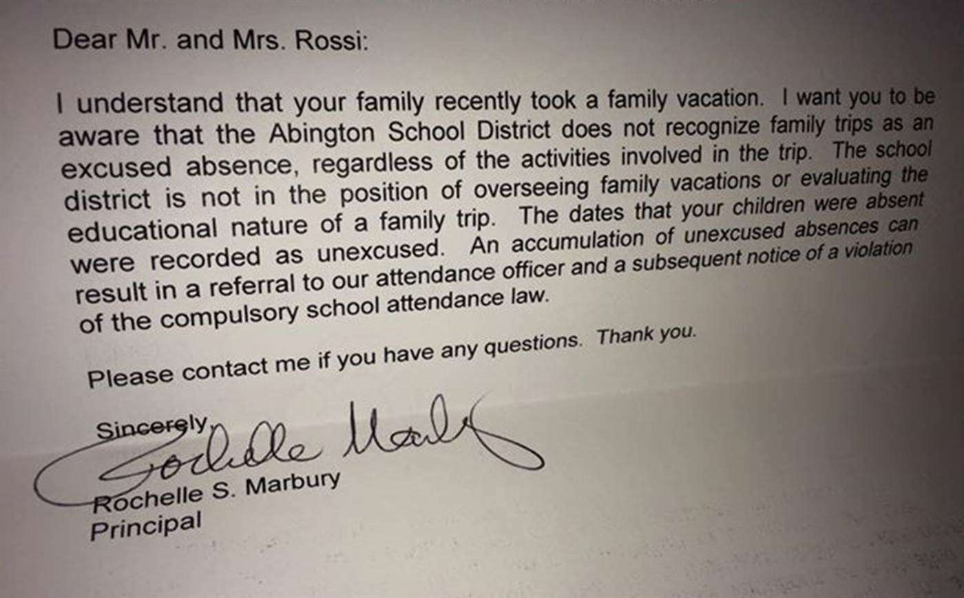 In 2015, Pennsylvania dad, Mike Rossi, qualified to run the Boston Marathon. He decided to take his kids out of school for a few days so that the whole family could enjoy an extended marathon weekend in Boston. Upon their return to Pennsylvania, Rossi and his wife received this letter from the principal of their children’s public school: