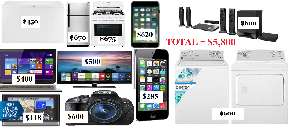 An American consumer or household spending that same amount of inflation-adjusted dollars today ($5,800) would be able to furnish their entire kitchen with five brand-new appliances (refrigerator, gas stove and oven, washer, dryer, and freezer) and buy seven state-of-the-art electronic items for their home (a Toshiba Satellite 15.6″ laptop computer, a Garmin 5 Inch GPS, a Canon EOS Rebel T5i DSLR Camera, a Sony 1,000 Watt, 5.1-Channel 3D Smart Blu-Ray Home Theater System, a Samsung 55 inch Smart HDTV, an Apple iPod Touch 64GB MP3 Player (6th generation), and an Apple iPhone 7 Plus.