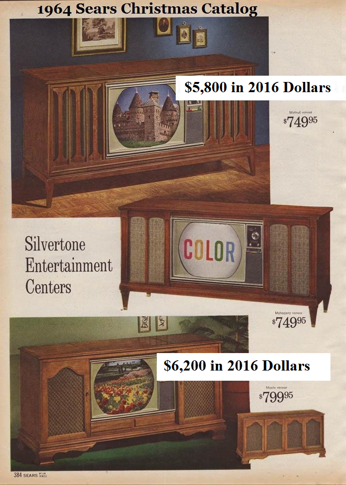 Pictured above are some color TVs from the 627-page 1964 Sears Christmas Catalog, from the Wishbook Web website (no longer available). The original prices are listed ($750 for the Sears Silvertone entertainment center and $800 for the more expensive one), and those prices are also shown converted to today’s 2016 dollars using the BLS Inflation Calculator: $5,800 for the basic 21-inch color TV model and $6,200 for the more expensive model.