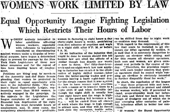 In short, the conclusion of the League is that these proposed bills and laws, ostensibly intended to protect and shield the woman worker, will, if permitted to stand, unquestionably work her industrial ruin and throw her back into the slough of drudgery out of which she is just emerging after centuries of painful, laborious effort to better her condition. (“Women’s Work Limited by Law,” New York Times, January 18, 1920)