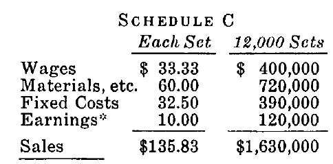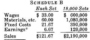 Note that in this illistration that 18,000 sets (instead of 12,000) have been produced with the same total labor costs and fixed costs, the same cost of materials per set, and the same 12 per cent earnings before taxes on capital invested ; which means that the minimum sales price needed to cover all ob ligations is now $121.67 a set in stead of $150.00. The company thus is much better able to compete than before.