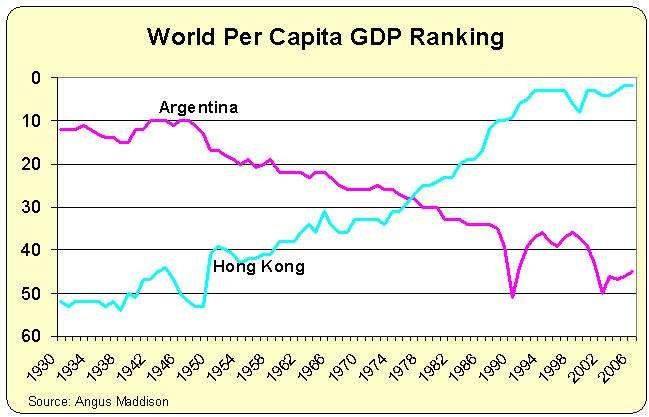 I put together a chart back in 2011 showing the relative rankings of both Argentina and Hong Kong. As you can see, Argentina used to be one of the world’s richest nations. Indeed, it was the world’s 10th-richest country when Perón took over. And Hong Kong was relatively poor. But look at what’s happened over time. Perón’s statist policies produced a steady decline while Hong Kong’s laissez-faire approach has now made it one of the richest jurisdictions on the planet.