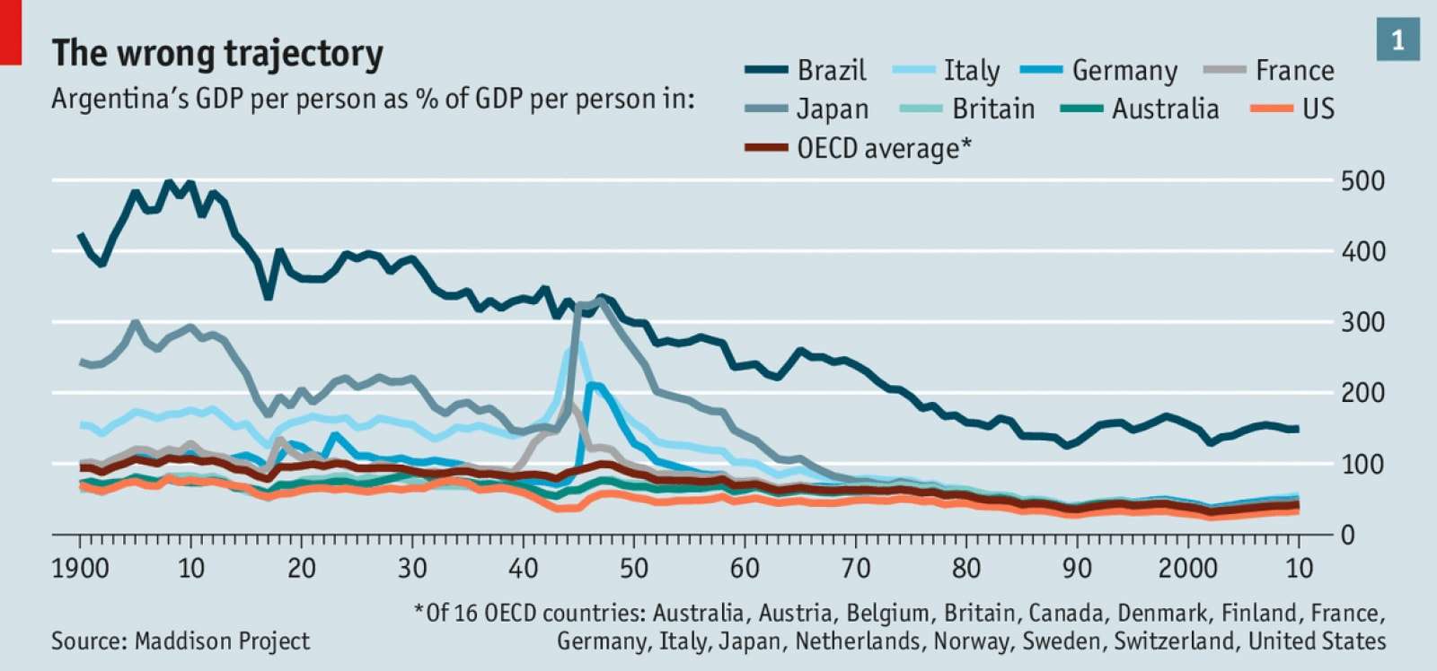The country ranked among the ten richest in the world…its standing as one of the world’s most vibrant economies is a distant memory… Its income per head is now 43% of those same 16 rich economies… As the urban, working-class population swelled, so did the constituency susceptible to Perón’s promise to support industry and strengthen workers’ rights.