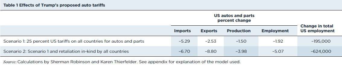 President Trump‘s proposed tariffs on imported automobiles and parts would cost the U.S. economy 157,000 jobs, according to a report by the Trade Partnership, a trade policy consultancy. “We find that the tariffs would have a very small positive impact on high-skilled workers in the motor vehicle and parts sectors, but very large negative impacts on workers — both high- and lower-skilled — in other sectors of the economy,” the study says. …the tariff policy would boost jobs in the auto sector by 92,000, but then destroy 250,000 jobs in the rest of the economy, according to the study. The price of foreign vehicles would rise from $30,000 to $36,400, a 21 percent increase. All in all, the economy would lose 0.1 percent of its value. Those effects don’t take into account any potential retaliation by American trade partners for the tariffs.