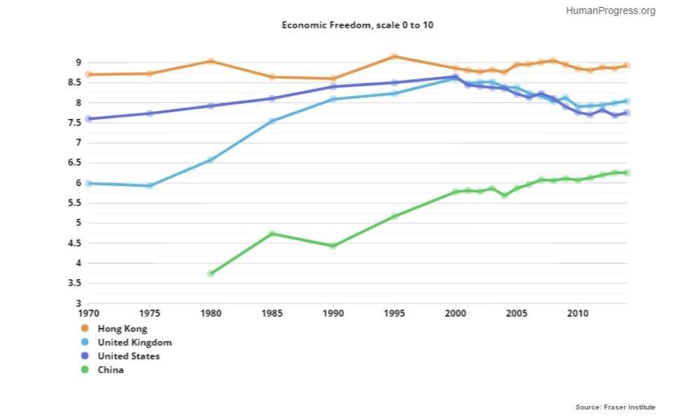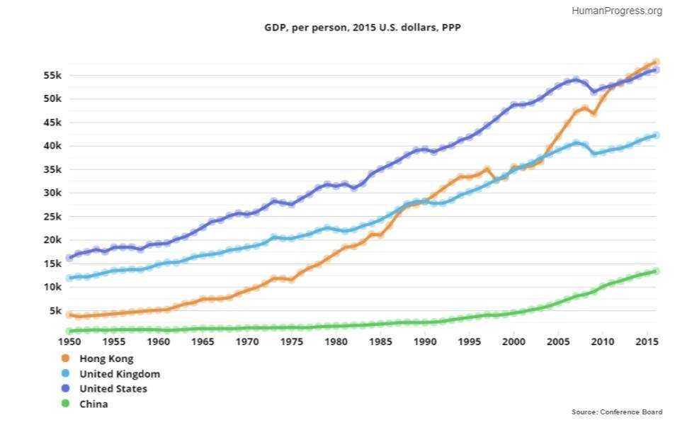 Economic freedom benefited millions of people in Hong Kong. More importantly, it benefited hundreds of millions of people in mainland China. As the territory grew ever richer, the Chinese communists were forced to admit the failure of socialism, embarking on their own road to great enrichment in 1978. Between that year and 2016, Chinese incomes grew sevenfold, resulting in the greatest poverty reduction in human history.
