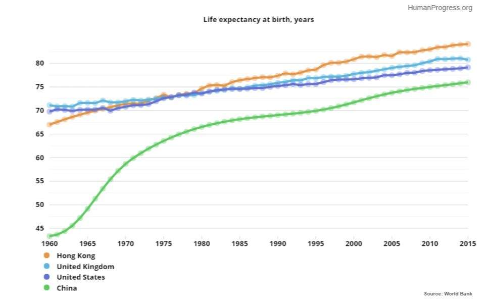 Back in 1960, life expectancy in the colony was 67 years. In the United Kingdom and America, it was 71 years and 70 years respectively. Once again, the tables have turned. Today, a resident of Hong Kong can expect to live to 84 years. Comparable figures for the United Kingdom and America are 81 years and 79 years respectively.