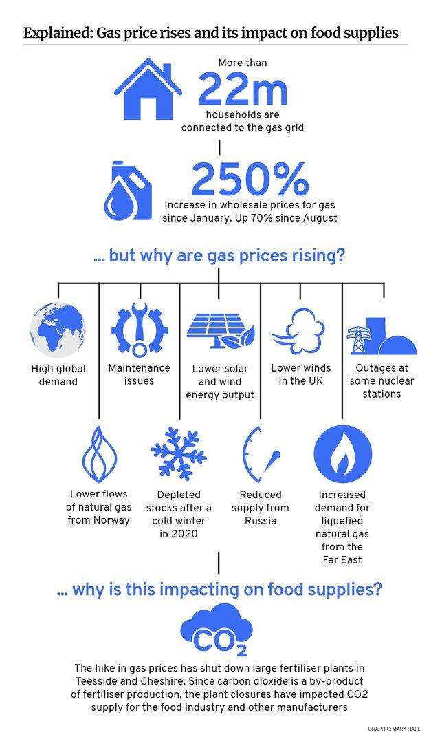 Two of the biggest fertilizer plants in the UK are owned by a company called CF Industries. Together, they normally produce about 60 percent of the UK’s food-grade CO2. However, these plants were actually shut down for a large part of September, which drastically reduced the UK’s CO2 production.