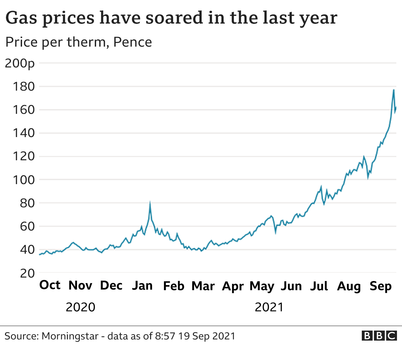 First, to say that natural gas prices are high in Britain is really quite the understatement. According to Industry group Oil & Gas UK, wholesale prices for gas in September were up 250 percent since January, and had increased 70 percent since August. As one UK energy CEO remarked, this is “the most extreme energy market in decades.”