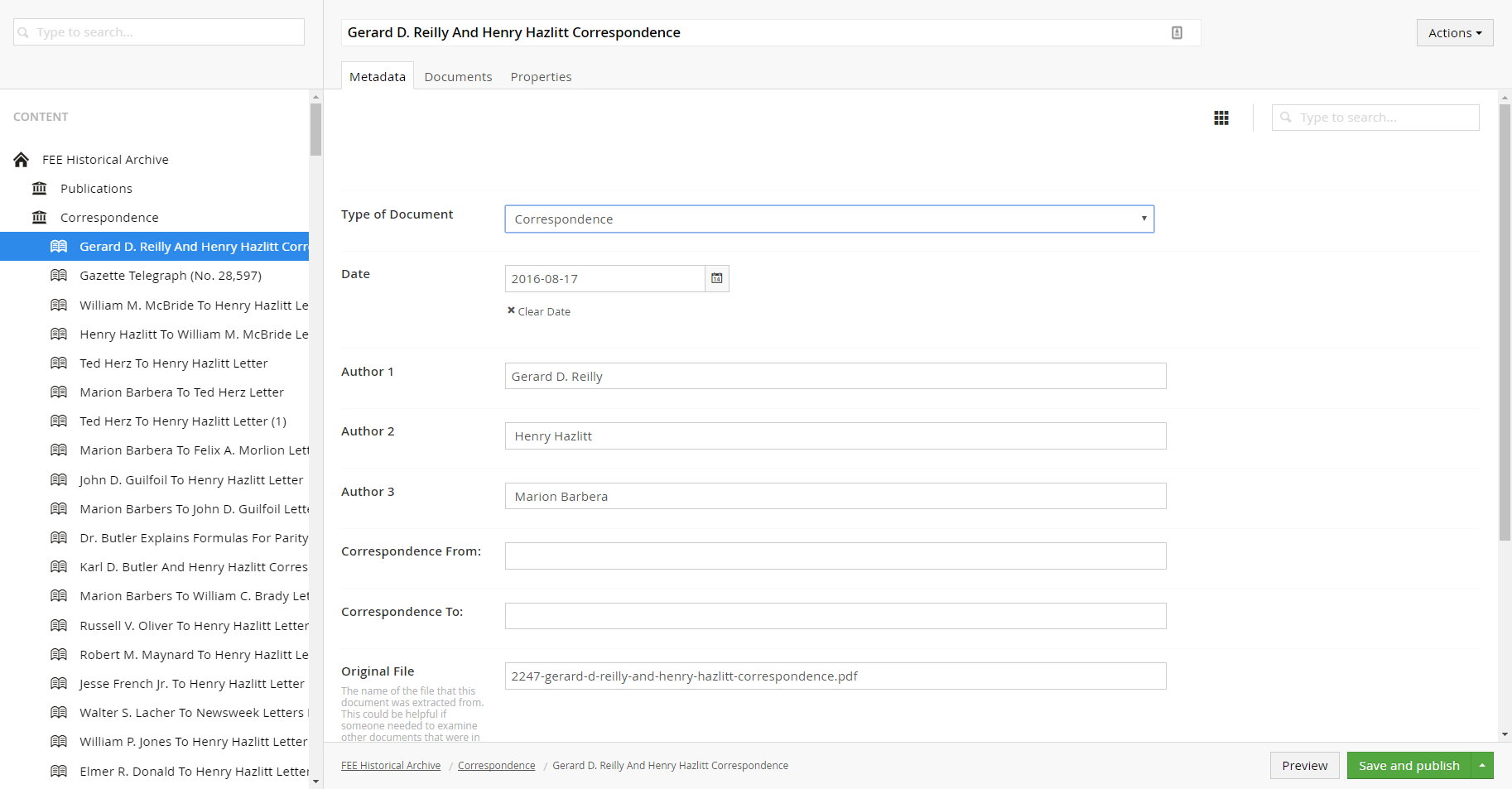 Since we wanted a separate record for each document, we had to split the large PDFs into their constituent documents. We also wanted to embed some metadata in the PDF itself both to make the files searchable and to enable us to use a script to automate the process of populating properties for each Umbraco document node. Metadata categories included document category, publisher, authors, date of publication, comments, etc.