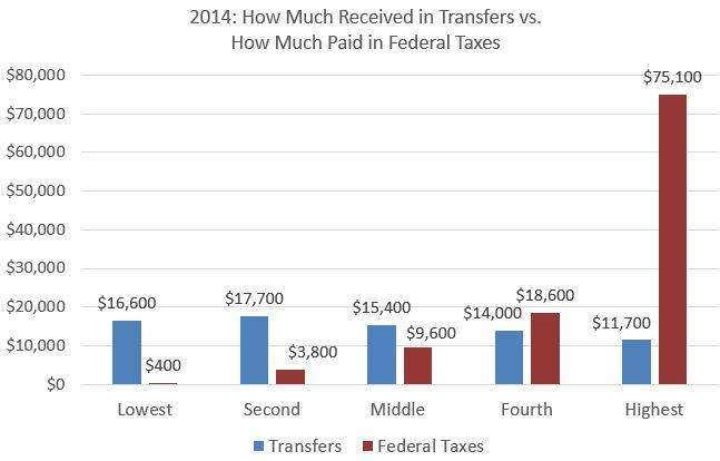 The figure below shows transfers and federal taxes by household across income quintiles. The lower three quintiles receive far more in government transfers than they pay in taxes. Only the top two quintiles pay more in taxes than they receive in transfers, effectively subsidizing the bottom groups.