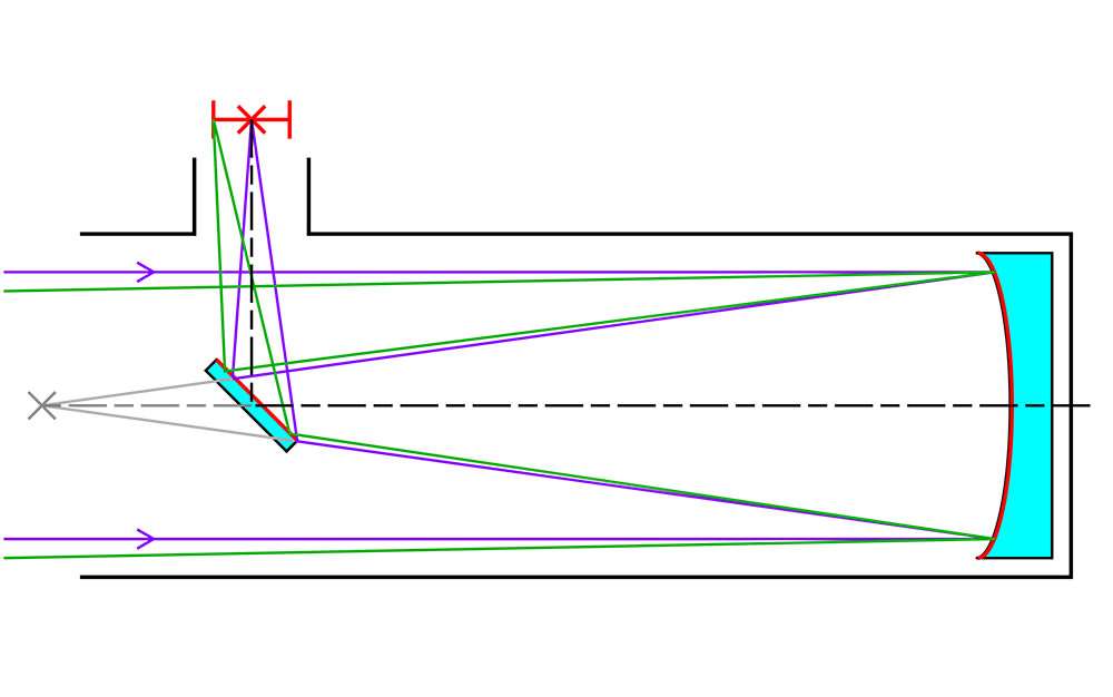 Early refracting telescopes were plagued with two major optical problems, known as spherical and chromatic aberration. First, a simple lens whose curved surface is a segment of a sphere – the only type possible with 17th-century technology – does not focus light at a single point, so it produces an inherently distorted image. Such spherical aberration could be reduced by using lenses with extremely long focal lengths, but that solution led to ever-longer, more unwieldy telescopes. The second problem, chromatic aberration, was what motivated Newton to develop a reflecting telescope in the first place. Each color of light bends with a slightly different angle when passing through a lens. In a rainbow, this effect is beautiful. In a refractor telescope, the red-light image forms a small distance away from the blue one and so forth, leading to blurring with colored fringes.
