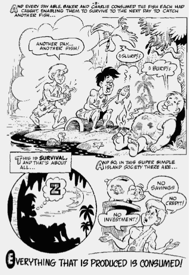 The comic starts with three islanders—Able, Baker, and Charlie—who live off of fish, which they catch in the sea. They have no tools to aid them, so they must fish with their bare hands. Fish, to the islanders, is a consumers’ good: something that is used to pursue their goals directly (in this case, the goals of satisfying hunger and not starving). But, fish can only be a consumers’ good when it is ready for consumption. The fish do the islanders no good while they are still swimming in the sea. So the islanders must engage in production. They must produce the product of “fish on a plate,” which is the true consumers’ good.