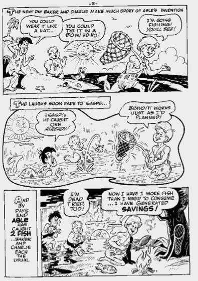 For example, as the comic book later indicates, the time preferences of Baker and Charlie are too high for them to make the net. Giving up eating today is too great a sacrifice for them, even if it would mean being able to eat three times as much tomorrow. If net fishing were more productive, that might have sweetened the deal enough; i.e., if the net netted five times as much, they might have been willing to wait. Their time preferences are not infinitely high. But they are not low enough to embark on this particular capital project.