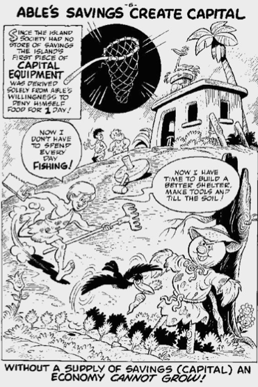 Then a little bird asks if Able’s penchant for accumulation is “greedy” and bad. “Bad for who?” responds a wise owl. There are only so many fish Able can eat, and only so many uses for his nets. To maximally benefit from his tremendous productivity, he must offer his products to others in the community in exchange for goods and services. And through exchanges like investments, loans, and wages, non-savers can get access to capital goods that would have otherwise been out of reach. For example, Able rents out his nets and loans out his fish at interest. This enables higher-time-preference islanders like Baker and Charlie to increase their productivity and living standards. And since all exchanges are, by definition, projected by both willing parties to be beneficial, the more exchanges the saver makes, the more he benefits the public.