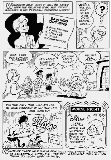 But then others on the island start getting their own ideas about what Able should do with his newly abundant resources. One man says, “Divvy up.” This is an example of the envy-based egalitarian ethos that has afflicted peoples throughout history and pre-history, keeping them poor and primitive. As Murray Rothbard wrote:
