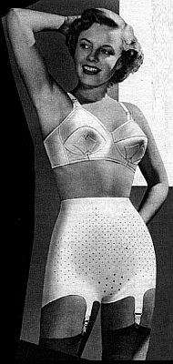 Underneath her conservative suit, the working woman of the 1950s would have worn something like the Playtex Living Girdle, made of perforated rubber, and designed to produce the sleek figure required by the fashions of the time.