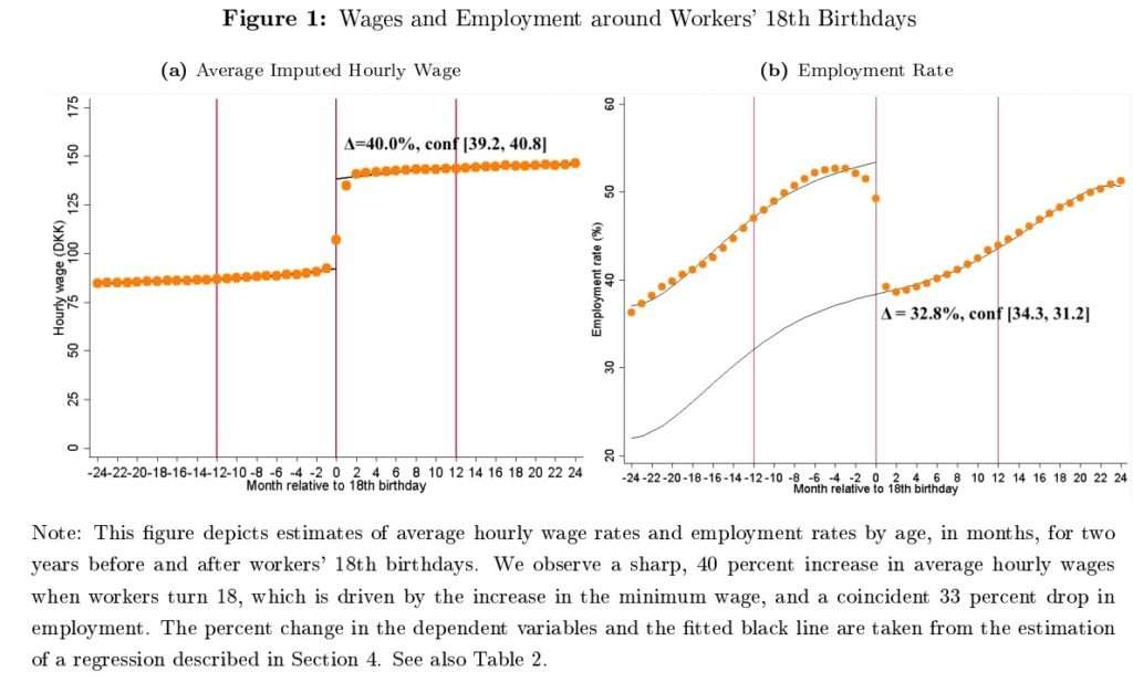 In addition to the Seattle study, another minimum wage paper crossed my path this week and it takes a very different approach than much of the literature. In Denmark, the minimum wage jumps up by 40% when a worker turns 18. Thus the authors, Kreiner, Reck and Skov, ask what happens to the employment of young people when they hit their 18th birthday? Answer: employment drops dramatically, by one-third.
