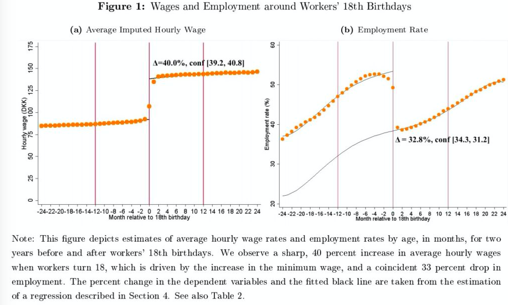 A picture tells the story. On the left is measured wages by age, the jump up due to the minimum wage law is evident at age 18. On the right is the employment rate–the jump down at age 18 is also evident as is a bit of pre-loss as workers approach their 18th birthday.
