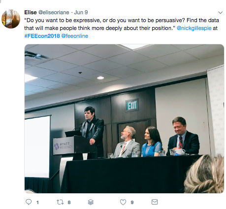When you’re live-tweeting, remember not to just share a picture of someone giving a talk. And don’t bother just inserting a caption about “X speaker talking about X topic.” Instead, listen for an interesting quote. Capture an interesting anecdote. Make a meaningful comment. It’s your job to share something that lives only in the live context of the event.