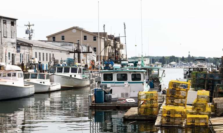 Image: Fishing boats moored in a canal in Portland Maine with lobster traps stacked on the dock (iStock)