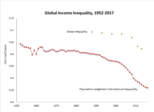 Some might feel that a decline in global income inequality is a good thing in and of itself. Others, myself included, would rather celebrate better schooling, health care, sanitation, and nutrition that globalization and rapid economic growth in developing countries have made possible.