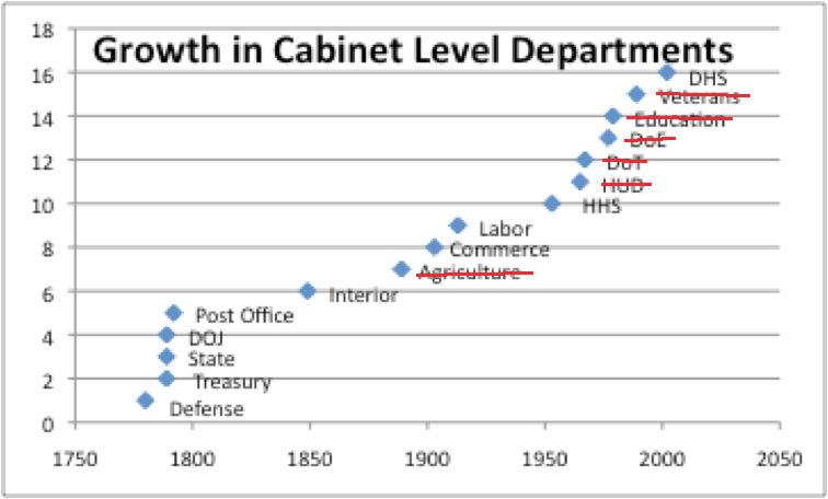 To conclude, I found a nice chart that shows when various departments were created, which I have helpfully augmented by crossing out the ones that I’ve explained should be abolished. As you can see, there is still some low-hanging fruit to go after.