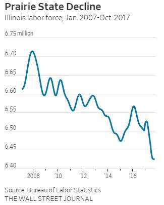 Democrats in Illinois ought to be especially chastened by new IRS data showing an acceleration of out-migration. The Prairie State lost a record $4.75 billion in adjusted gross income to other states in the 2015 tax year, according to recently IRS data released. That’s up from $3.4 billion in the prior year. …Florida with zero income tax was the top destination for Illinois expatriates… What’s the matter with Illinois? Too much for us to distill in one editorial, but suffice to say that exorbitant property and business taxes have retarded economic growth. …Taxes may increase as Democrats scrounge for cash to pay for pensions. …Illinois’s unfunded pension liabilities equalled 22.8% of residents’ personal income last year, compared to a median of 3.1% across all states and 1% in Florida. …Illinois’s economy has been stagnant, growing a meager 0.9% on an inflation-adjusted annual basis since 2012—the slowest in the Great Lakes and half as fast as the U.S. overall. This year nearly 100,000 individuals have left the Illinois labor force.