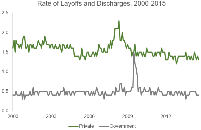 And, to a close approximation, nobody gets fired, either. The rate of firing and layoffs for public employees is 71% lower than in the private economy (except for once in the summer of 2010, when states had such massive revenue shortfalls they literally did not have the money to pay them).