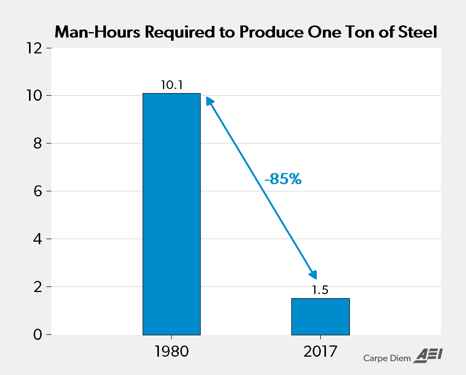 It now takes 85 percent fewer man-hours to produce a ton of steel than it did in 1980.