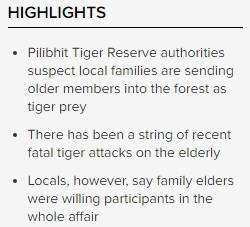 …Authorities surmise that people are sending older members of the family into the tiger reserve for them to become a prey. Once killed, their bodies are relocated to fields, and staged as victims of a tiger attack, so that the respective family can claim lakhs in compensation from the government.