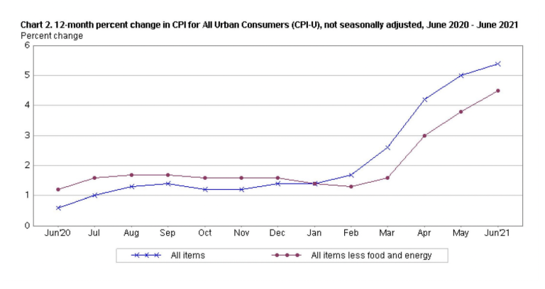 The federal government just released the latest Consumer Price Index (CPI) for June 2021, an imperfect but useful metric that tracks general price inflation in a bundle of typical consumer goods. Basically, it attempts to illustrate how much prices are rising for the goods average Americans buy regularly. The June edition shows prices once again sharply on the rise, with a 0.9 percent increase from May to June. From June 2020 to June 2021, the data show that consumer prices rose a whopping 5.4 percent.