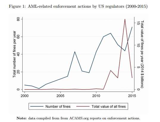 The past fifteen years have seen an unprecedented level of attention on anti-money laundering…issues by financial regulators…the total value of fines levied by regulators peaked at $15 billion in 2014 in the US alone. …Between 2010 and 2015, the Financial Action Task Force (FATF), an international group tasked with setting common AML standards across the globe, added over fifty different countries to an internationally-recognized list of high risk countries. …there are growing concerns that this increase in regulatory activity is leading to a chilling effect on cross-border economic activity as banks limit their exposure to high risk clients or jurisdictions, a process known as ‘de-risking’… This contraction of the correspondent banking network has sounded a number of alarm bells, as these services are seen as being crucial for most cross-border services… The ICC survey reported that over 40% of respondents felt that AML and know-your-customer (KYC) requirements were a significant impediment to trade finance, with nearly 70% reporting they declined transactions that year…a large number of money transfer companies in the US, the UK and Australia have lost access to banking services as a result of banks’ desire to reduce their exposure to regulatory risk, potentially leading to a reduction to a decrease in formal remittances to developing countries, a critical source of development finance… The combined effect of all of these pressures should be leading to declines in the aggregate flow of cross-border payments.