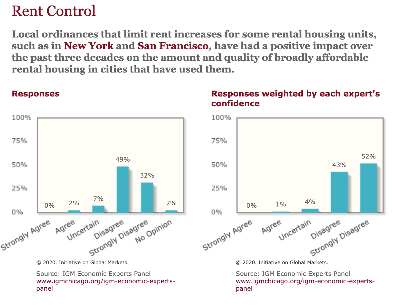 Surveys of top economists routinely show near-consensus on this issue. For example, an IGM Economic Experts Panel survey of top economists found that weighted for confidence, only 1% of respondents agreed that rent control works. A whopping 95% disagreed, with 4% uncertain.