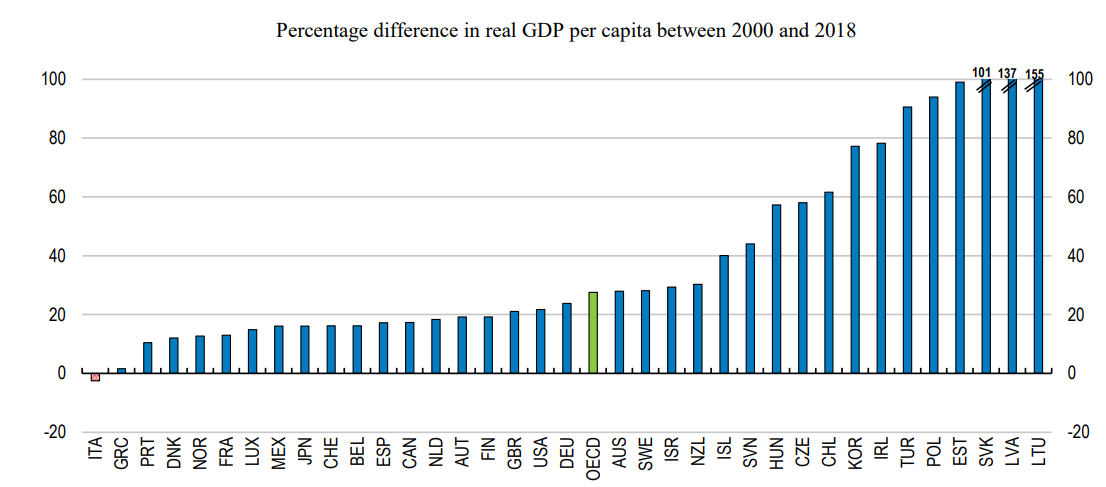Looking at the long-term growth prospects, the statistics show a shocking result that Italy’s GDP per capita remains stagnant at the same level as 18 years ago.