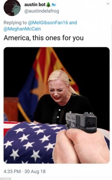 Shortly after Sen. John McCain’s death, a Twitter user posted a tweet that included a doctored photo of Sen. McCain’s daughter, Meghan McCain, crying over her father’s casket. The tweet included the words “America, this ones (sic) for you” and the doctored photo, which showed a handgun being aimed at the grieving McCain. McCain’s husband, Federalist publisher Ben Domenech, criticized Twitter CEO Jack Dorsey for keeping the tweet on the platform. Twitter later took the offensive tweet down, and Dorsey apologized for not taking action sooner.