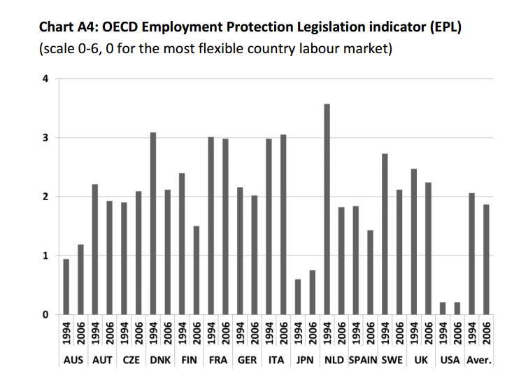 But let’s get back to our main topic. What actually happens when nations have high or low levels of Employment Protection Legislation?
