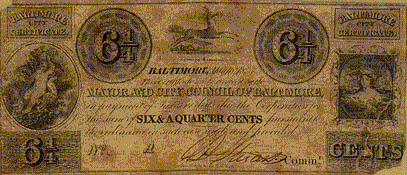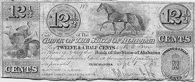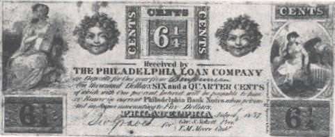 Postscript: The small denomination notes shown are scrip issued at various times during the early 19th Century. Usually this happened when the banks were in a general suspension and coins disappeared from circulation. The Dollar, you see, was adapted from a Spanish coin, the real or “piece of eight.” A “bit,” or a one-eighth part of the dollar, was therefore worth 12½ cents, and a half-bit 6¼ cents. While it took some time for decimalization to take hold on Main Street in America, it took much longer for it take hold on Wall Street.
